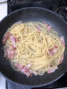 スパゲティを投入したら、手早く和えて、オリーブオイルとベーコンの脂を馴染ませるようにしましょう。この時、ちょっと水分が多いかな、くらいの加減になると良いですが、水分が足りないようなら普通のお湯を足しましょう。
