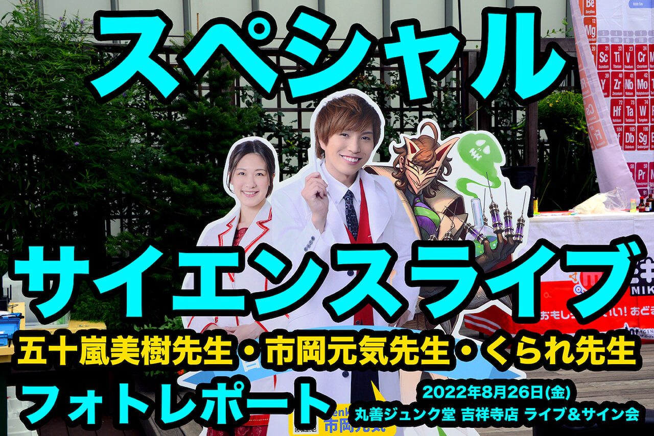 2022年8月26日(金)、ジュンク堂書店 吉祥寺店の主催で、元気先生、五十嵐先生、くられ先生のお三方でサイエンスライブを行いました。その様子を、フォトレポートでお届けします。