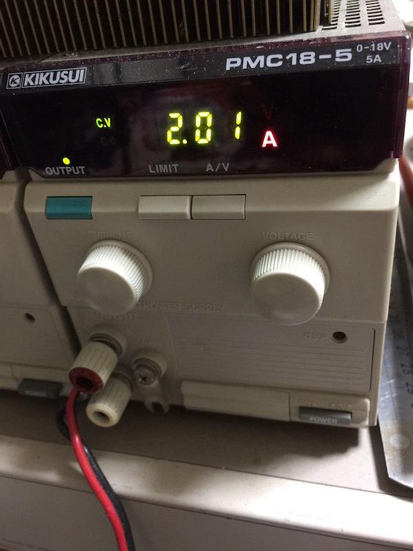 USB端子から供給される電圧は通常は5V。このため、安定化電源側で5Vにセットします。LEDライトのスイッチを入れると点灯させたところ、この時の電流は2.01Aとなりました。