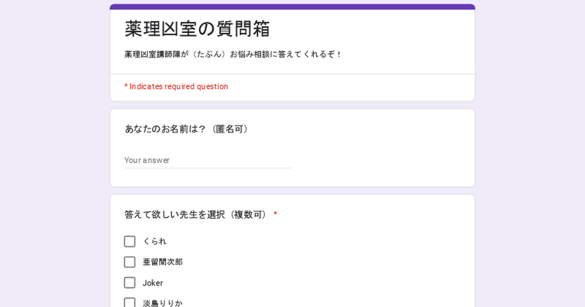 薬理凶室講師陣が、あなたのお悩み・人生相談・質問に(たぶん)答えてくれます。